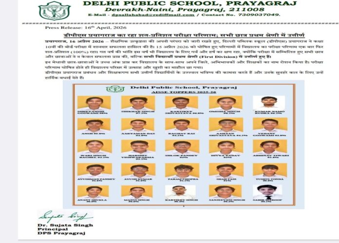 सीबीएसई दसवीं के जब परिणाम आए तो किसी एक टॉपर का नहीं, बल्कि पूरे विद्यालय का जश्न था। दिल्ली पब्लिक स्कूल (डीपीएस) प्रयागराज ने 10वीं की बोर्ड परीक्षा में ऐसा कीर्तिमान रचा, जहां हर छात्र-छात्रा सफलता की पहली श्रेणी में खड़े नजर आए। सौ प्रतिशत परिणाम के साथ सभी विद्यार्थियों का प्रथम श्रेणी में उत्तीर्ण होना, इस उपलब्धि को और भी खास बना देता है। 15 अप्रैल को घोषित परिणामों ने यह साफ कर दिया कि डीपीएस प्रयागराज में सफलता कोई संयोग नहीं, बल्कि सुनियोजित मेहनत, अनुशासित अध्ययन और मजबूत शैक्षणिक संस्कृति का परिणाम है। यहां हर छात्र को आगे बढ़ाने की सोच ही इस कामयाबी की असली ताकत बनी।